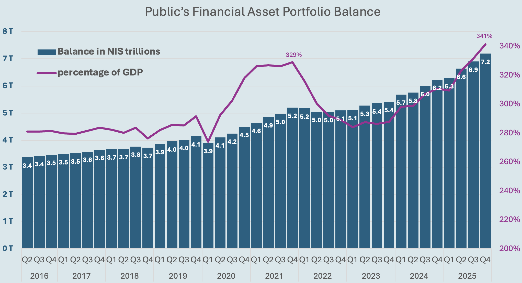 In the fourth quarter of 2025, total asset balances rose by 4.2% to a record NIS 7.2 trillion, continuing the steady growth seen in recent years. The portfolio expanded not only in nominal terms but also relative to the size of the economy, with its value reaching an all-time high of 341% of GDP. This is another indicator of Israel's substantial financial resilience and strength.