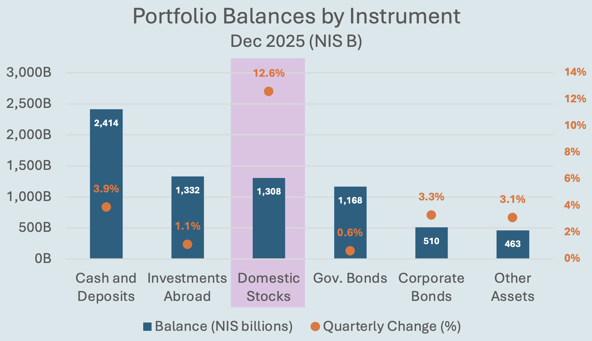 Portfolio balances delivered exceptional performance in 2025, led by +12.6% quarterly rise in domestic stocks (+NIS 145.8b). Investment abroad grew by 1.1%, with foreign equity holdings increased by about NIS 20.4b, while foreign bonds, both corporate and government, declined by about NIS 4b due to shekelās appreciation. Cash and deposits also remained substantial at NIS 2.4 trillion, reinforcing the portfolioās liquidity and overall financial stability.