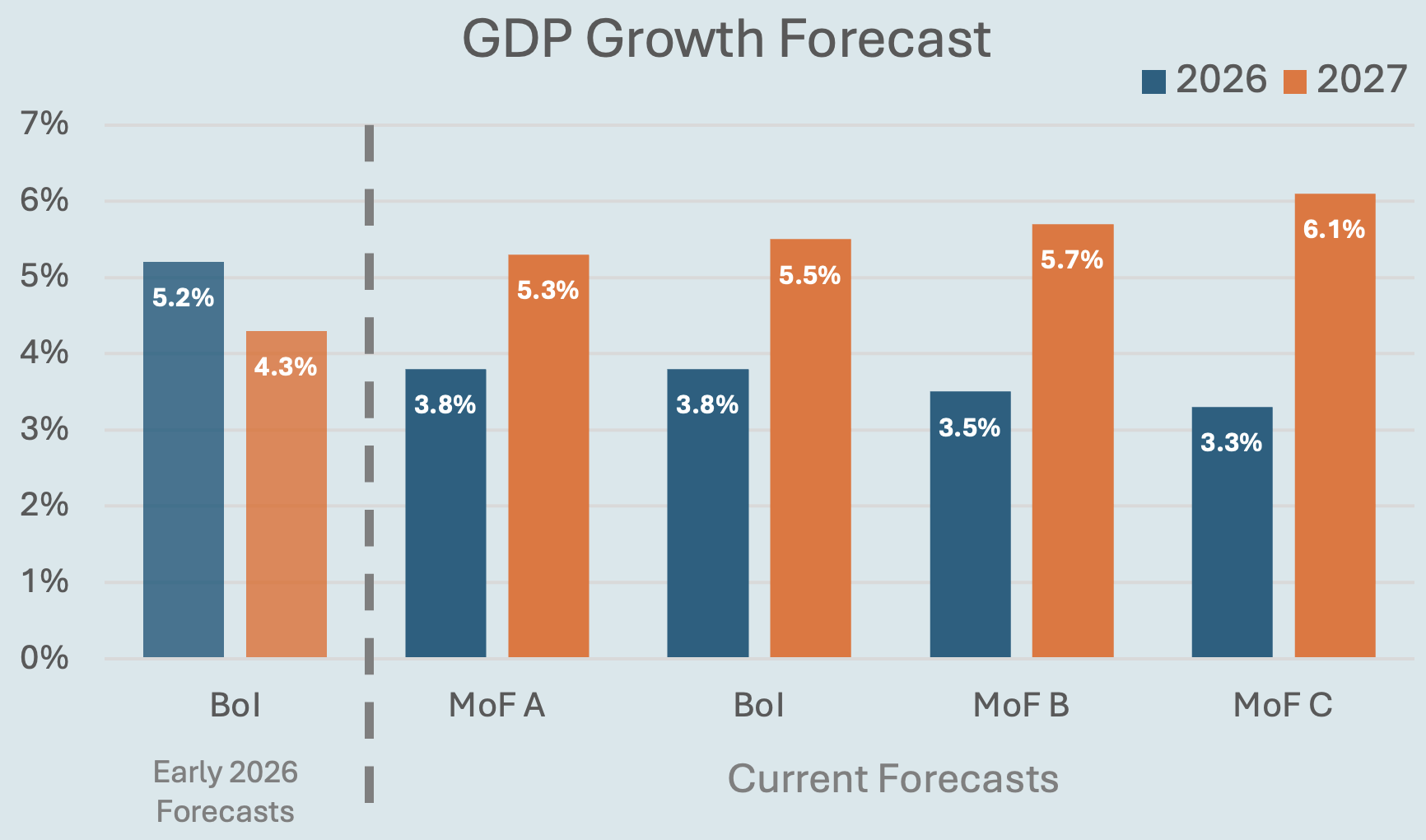 The Bank of Israel presented only its baseline scenario, but it also pointed to a similar shift in growth from 2026 into 2027. Under its updated forecast, growth is expected to reach 3.8% in 2026 and 5.5% in 2027. The Bank of Israelās forecast also included an inflation projection of 2.2% for 2026, as well as a debt-to-GDP ratio that is expected to rise to around 70.5%.
