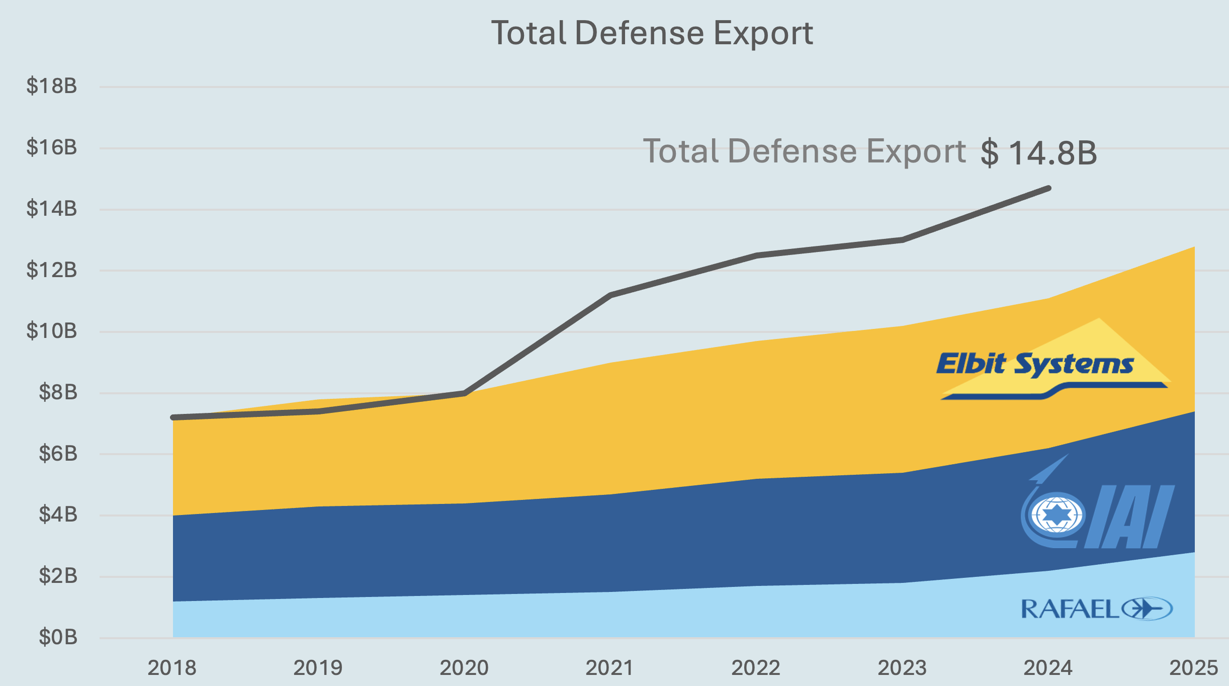 Israelâs defense exports doubled from $7.2 billion in 2019 to $14.8 billion in 2024, reaching about 10% of total goods and services exports. The three largest defense exporters expanded their exports by 41% over this period, with an additional sharp increase of 15.6% in 2025.