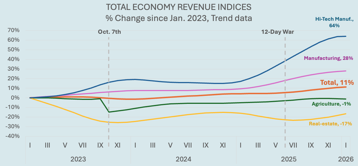 Additional data published this week by the Central Bureau of Statistics points to a 3% increase in business revenue across the economy in 2025, and an 11.2% increase in high-tech sector revenue. The trend over the most recent months, from November 2025 to January 2026, shows an 8.4% annualized increase in total business revenue across the economy, following an 11.4% increase in the preceding period. At the same time, the unemployment rate declined in February and now stands at just 2.3%.