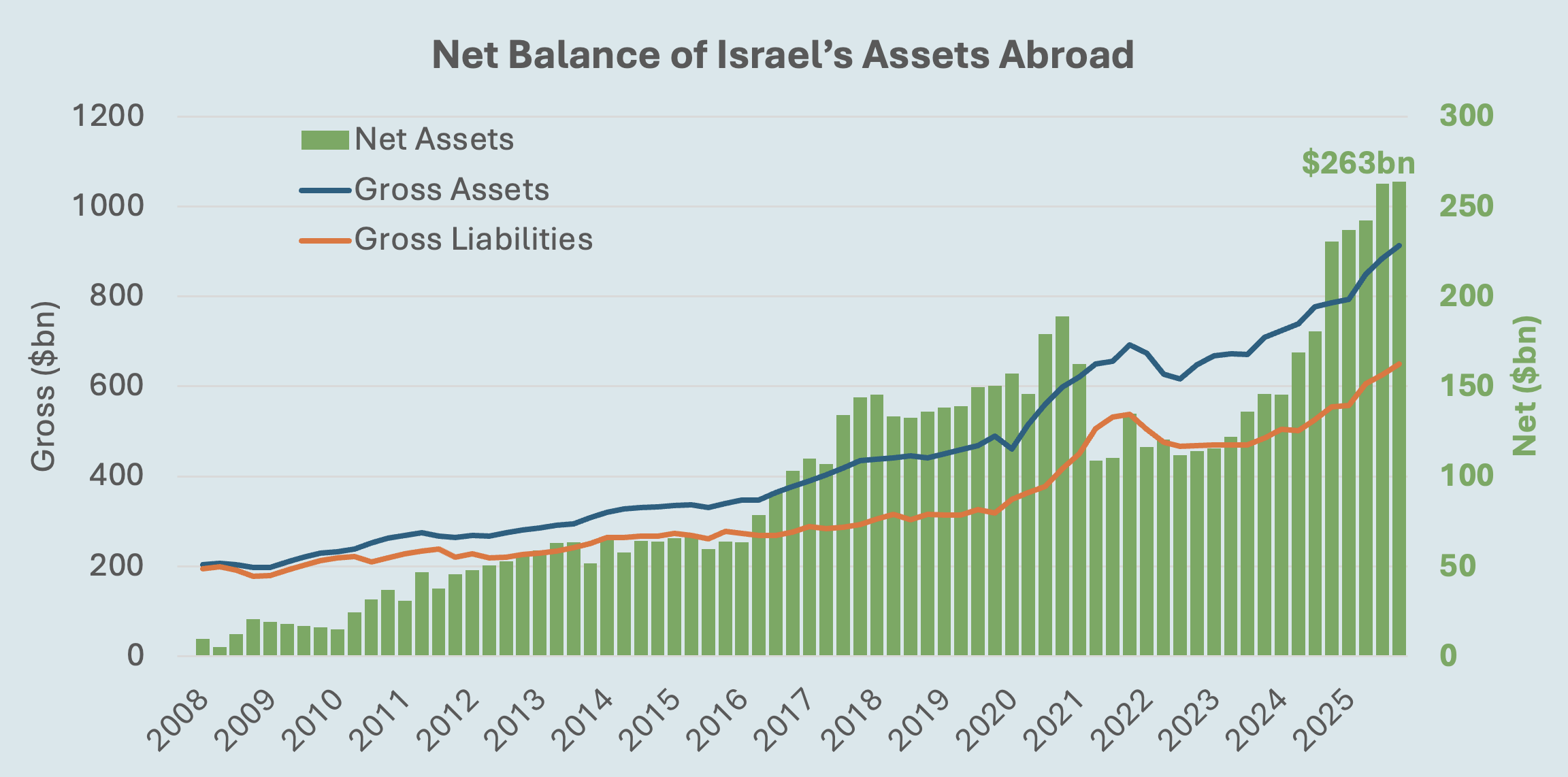 Israelâs net foreign asset position reached $263 billion at the end of December, up about $1 billion, or 0.3%, from the previous quarter. The gain reflects faster growth in Israeli assets abroad than in foreign liabilities in Israel. Over time, this steadily widening surplus highlights strong capital accumulation and external resilience, reinforces Israelâs position as a net global creditor, and supports long-term financial stability.