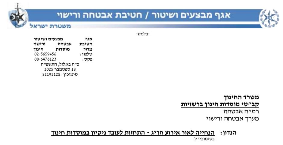 מצורפת תזכורת לביצוע רצף העסקה למאבטחים / בודקים במוסדות החינוך המתוקצבים עבור שנה"ל תשפ"ו.