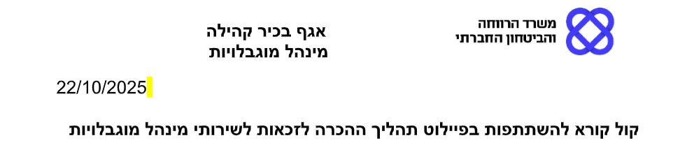 השבוע התקיים וובינר עם מפקחי קהילה מאגף מוגבלויות במשרד, ליישובים שנרשמו לקול קורא להשתתפות בפיילוט תהליך ההכרה לזכאות לשירותי מינהל מוגבלויות.