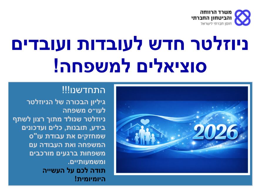 לאחרונה פורסם ניוזלטר של המשרד, ייעודי לעו"סים בתחום המשפחה. אנו מברכים על המיזם ורואים בו צעד חשוב בהכרה בתפקיד הליבה של עו"ס משפחה במחלקות לשירותים חברתיים. תעודדו את העובדות והעובדים להירשם לניוזלטר, להיות מעודכנים ולהרגיש חלק מקבוצת איכות בפני עצמה. הניוזלטר מצורף בהמשך.